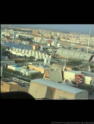 The southern end of the Expo site featured Flags of the World and the pyramidesque rusted brown colour Seville World Trade Centre. The unique design of the Centre allowed for maximum natural air conditioning.