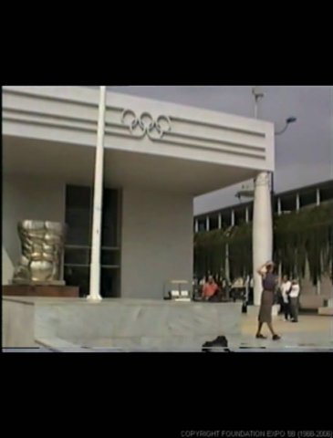 Here one can view the Canal of Discoveries as it makes its way to the Lake of Spain (image foreground), and to the southern end of the Expo site (image background). The Auditorium - a several thousand seated open-air theatre is visible at image background left. The model Ariadne rocket is at image background centre. The cable car ride linking the Expo site with the Seville-side of the Guadalquivir River is at image right.